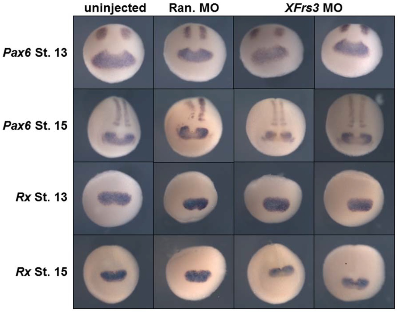 Supplement Fig. 8. XFrs3 Mo does not affect the initial expression of eye markers Pax6 and Rx. XFrs3 or random (Ran.) control MO (7.5 pmole each/embryo) was injected to equatorial region of 2-cell embryos, and embryos are analyzed by in situ hybridization for Pax6 and Rx at indicated stages (St. 13 and 15).