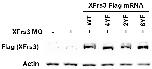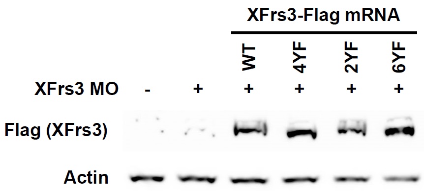 Supplement Fig. 9. Wild type and mutant XFrs3 mRNAs are translated with similar efficiencies. Indicated combinations of XFrs3 MO (7.5 pmole/embryo) and C-terminal Flagtagged XFrs3 mRNA (XFrs3-Flag, 50 pg each/embryo) were injected to equatorial region of 2-cell embryos. The levels of XFrs3-Flag proteins in stage 10 embryos are compared by anti- Flag immunoblotting [Flag (XFrs3)]. Actin is used as a loading control.