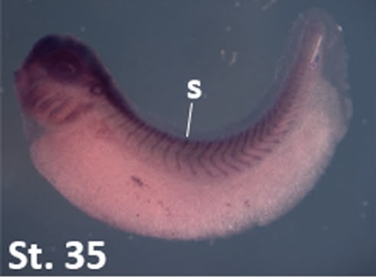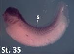 frs3 (fibroblast growth factor receptor substrate 3) gene expression in Xenopus laevis embryo, assayed via in situ hybridization, NF stage 35, lateral view, anterior left, dorsal up.