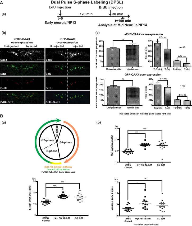Figure 2. Overexpressing Activated aPKC Causes Progenitor Proliferation and Shortens the Cell Cycle by Shortening G1 and S Phases(A) DPSL analysis (a) shows that embryos on the aPKC-CAAX injected side show higher number of Sox3+ progenitors (b and c) and have shorter cell cycle (TC) and S phase (TS) (c, mean ± SEM). Control embryos overexpressing GFP-CAAX showed no such differences. The scale bar in (Ab) represents 100 μM. See also Figure S1.(B) Schematic of Fucci cell cycle biosensor, which can be visually used to measure the lengths of various phases of cell cycle, is shown (a). When live imaged in the presence of either a pseudosubstrate inhibitor (MyrPSI) or a chemical inhibitor (Gö6983/GO) against aPKC, HeLa Fucci cells showed a significant increase in cell-cycle length (TC) due to elongated G1 and early S phases (b, mean ± SEM). Time-lapse movies are shown in Movies S1AâS1C. |