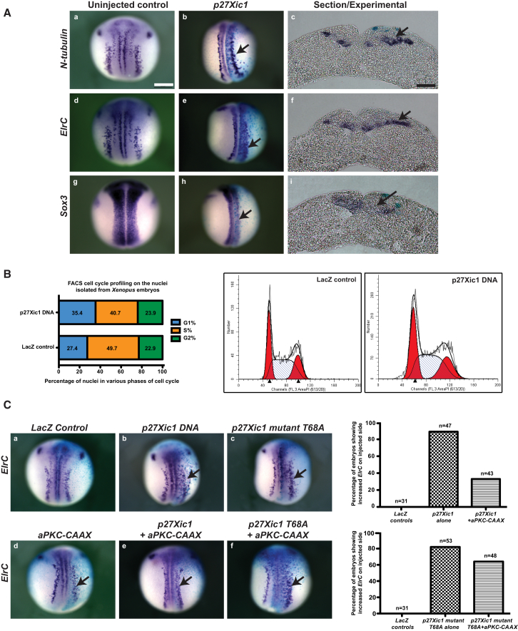 Figure 5. p27Xic1 Overexpression Promotes Neuronal Differentiation, and This Effect Is Rescued by Overexpression of aPKC-CAAX(A) The neuronal markers N-tubulin and ElrC were increased and progenitor marker Sox3 was decreased on the p27Xic1 injected (right; arrows) side in the embryos, as seen on whole mounts and sections. See also Figure S6.(B) FACS cell-cycle profiling on p27Xic1-overexpressing embryos shows a significantly higher percentage of nuclei in the G1 phase, compared to control embryos, suggesting an elongation of G1.(C) The increase in neuronal differentiation, observed by p27Xic1 overexpression, is rescued by coexpression of aPKC-CAAX, but it could not effectively rescue the ectopic neurogenesis caused by overexpression of phosphomutant p27Xic1 (T68A). Scale bars in (Aa) and (Ac) represent 500 μM and 50 μM respectively. |