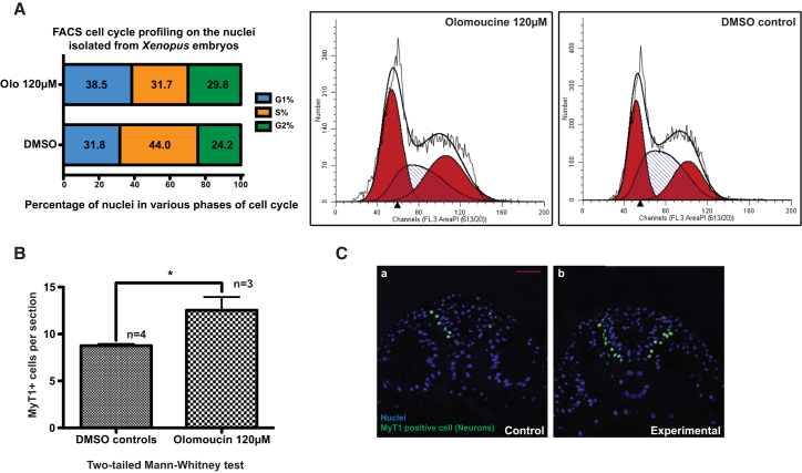 Figure 6. Elongating G1 Phase by Nongenetic Means Promotes Neuronal Differentiation(A) Growing Xenopus embryos from NF10 to 20 in the presence of 120 μM olomoucine, an inhibitor of cyclin-dependent kinases and G1 progression, may elongate the G1 phase of the cell cycle, as indicated by the cell-cycle profiling of the nuclei isolated from NF20 embryos. Experimental embryos showed a higher number of nuclei in the G1 phase of the cell cycle than the control embryos.(B) Experimental embryos, when stained with neuronal differentiation marker MyT1, showed a significantly higher number of differentiated neurons in comparison to control (mean ± SEM).(C) Examples of sections from control and experimental embryos stained with MyT1 antibody (green). Nuclei are blue and scale bar represents 50 μM. |