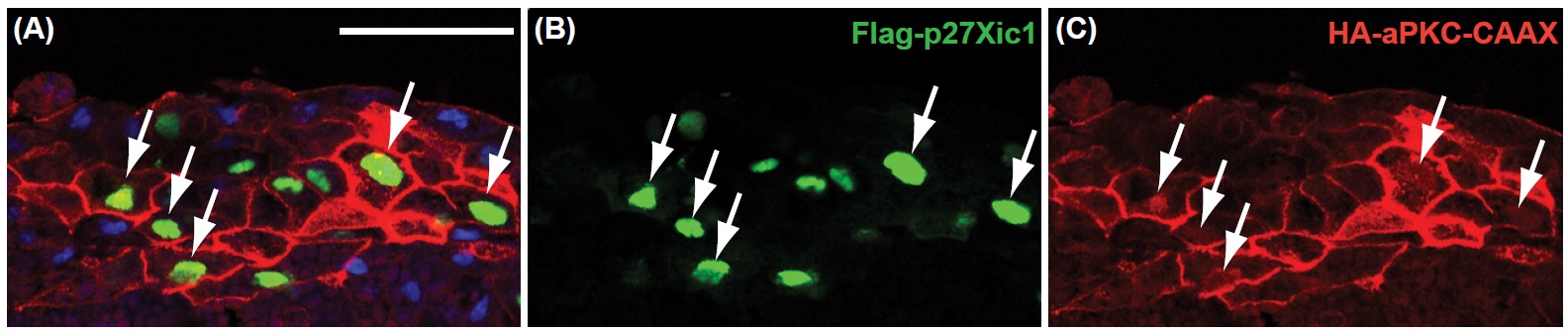 FigS3, related to fig3: Regulation of p27Xic1 activity by aPKC likely takes place in the cell nucleus. To see where in the cell p27Xic1 and aPKC-CAAX interact with each other, we overexpressed Flag-p27Xic1 and HA-aPKC-CAAX in Xenopus embryos and let them grow until neurula stage. The embryos were fixed, sectioned and immunostainied using anti-Flag and anti-HA antibody for detection of Flag-p27Xic1 and HA-aPKC-CAAX repectively. Immuno-staining showed that Flag-p27Xic1 (green) was largely in the nucleus of the cells, but a portion of aPKC-CAAX (red), which was mostly localized to the cell cortex, was also found in the nucleus (see the white arrows). These stainings led to the idea that aPKC interacts with p27Xic1 in the nucleus. White scale bar in A represents 50μM. |