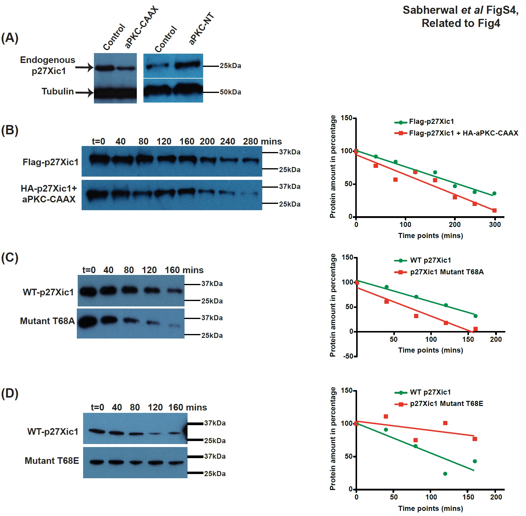 FigS4, related to fig4: Effects of aPKC on protein abundance and stability of p27Xic1. (A) Embryos overexpressing constitutively active aPKC (aPKC-CAAX) or dominant negative form of aPKC (aPKC-NT) show reduced or increased levels of endogenous p27Xic1, respectively. (B) Cycloheximide treatment of HeLa cells overexpressing Flag-p27Xic1 alone or in combination with HA-aPKC-CAAX shows that half-life of p27Xic1 is reduced in the presence of aPKC-CAAX, suggesting that p27Xic1 phosphorylation by aPKC might affect its half-life. (C) But contrary to the expectations, phospho-mutant of p27Xic1 (eg. T68A) showed protein destabilization, while protein for its phospho-mimetic mutant (T68E) showed enhanced stability (D), leading to the idea that the effects of aPKC on the stability of p27Xic1 are complex and can not be mimicked by singlepoint mutations on p27Xic1. |