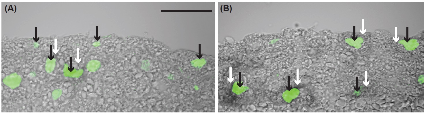 FigS6, related to fig5: (A) p27Xic1 promotes neurogenesis in a cell autonomous manner. To see if the effects of p27Xic1 on neurogenesis were cell autonomous or not, we combined the in situ hybridisation (non-fluorescent, black precipitation) against neuronal differentiation marker N-tubulin with immunostaining (fluorescent, green) against Flag-p27Xic1 using anti-Flag antibody, on embryos overexpressing Flag-p27Xic1. Sections from the embryos were imaged. As an example of the sections shows, overexpression of Flag-p27Xic1 (green, black arrow) promotes neurogenesis (N-tubulin, black precipitation, white arrow) within the same cells overexpressing p27xic1. In image âAâ, outer superficial polarised cells show no N-tubulin expression even after Flag-p27Xic1 overexpression. (B) Phospho-mutant p27Xic1 can also promote neurogenesis in the outer superficial polarized cells as well. Cells overexpressing Phospho-mutant Flag-p27Xic1 (that can not be rescued by aPKC unlike wild type Flag-p27Xic1) promotes neurogenesis not only in the inner nonpolar cells but in the outer superficial polarised cells as well. The images also show that Flag-p27Xic1 protein is localised exclusively to the cell nucleus. Black scale bar in A represents 50μM. |