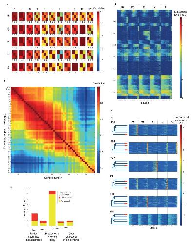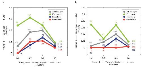 Extended Data Figure 7. Truncated endoderm gene set controlTo exclude the possibility that general genes are included as “endoderm-specific” since the endoderm program is induced earlier, we excluded temporal clusters 8, 9, 10 from the endoderm genes and repeated the relevant analyses. We found that there is no dramatic change in the results. The results are shown in the same format as Figure 3 and 4b-c.