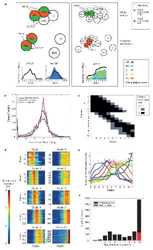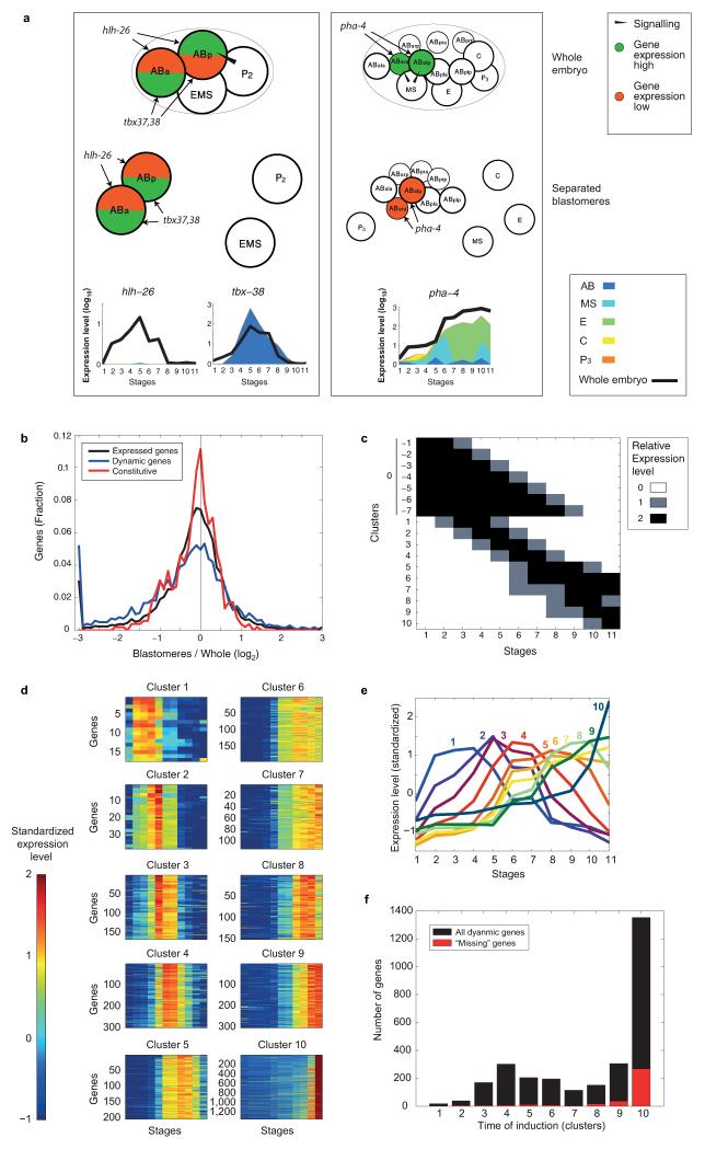 Extended Data Figure 3. Lineage restricted gene expression identifies genes dependent upon coherence of the lineages and tissue specificitya, Expression profiles of genes involved in pharynx specification. The left and right panels correspond to the two Notch signaling events. The top and bottom images correspond to the expected regulatory patterns in the whole embryo and isolated blastomeres, respectively. tbx-37 is not shown since it is identical to tbx-38 in expression profile. b, Comparison of the overall sum of expression between the two time-courses, plotted on a log2 scale (black). Genes “missing” in the separated lineage time-course were manually added to the graph at −3. The additional plots indicate the same measure for dynamically expressed genes (blue) and constitutive genes (red). c, Idealized expression profiles used to identify gene expression clusters. d, The gene expression profiles for the temporally restricted gene expression profiles. Each profile was “standardized” by subtracting its mean and dividing by its standard deviation. e, Average expression profiles of ten clusters of dynamically expressed genes determined based upon the whole embryo expression data (see Methods). f, The number of dynamic genes in each temporal period In each group, the genes not expressed in the lineage time-course (b) are marked in red.