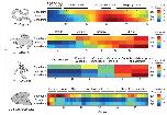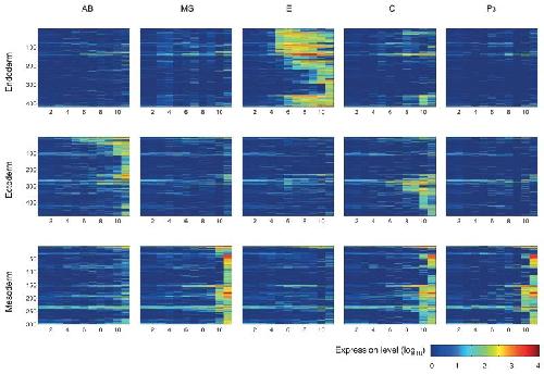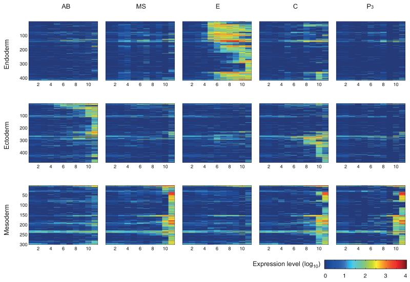 Extended Data Figure 5. Germ layer specific expressionExpression profiles of the germ layer specific genes in each of the lineages. The x- and y-axes are the eleven examined temporal stages and individual genes, respectively. Germ layer specific genes were identified by hierarchical clustering based upon correlation among dynamically expressed genes (see Methods).