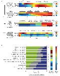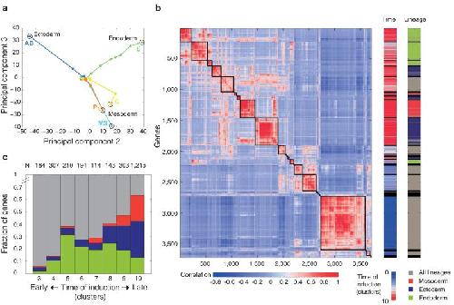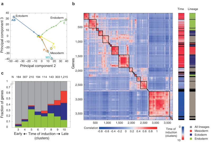 Figure 2. Dynamics of germ layer gene expression throughout developmenta, PCA on dynamically expressed genes for the five lineage time-courses (See Extended Data Fig. 4 for PC1). Adjacent stages of the same lineage are connected by a line, the terminal stage is indicated by a circle. b, Heat map indicating Pearson’s correlation coefficients between blastomere expression profile of dynamically expressed genes. The right-side bars indicate the time of expression (temporal clusters, as in Extended Data Fig. 3c-e) and the location of expression. c, Summary of location of expression for genes according to temporal clusters.