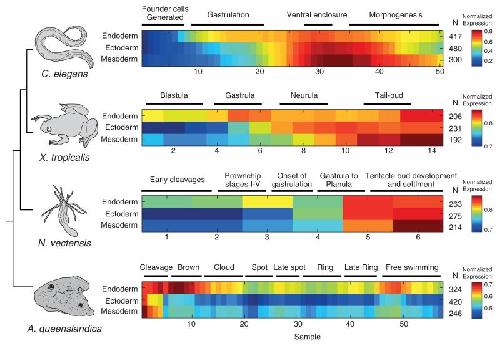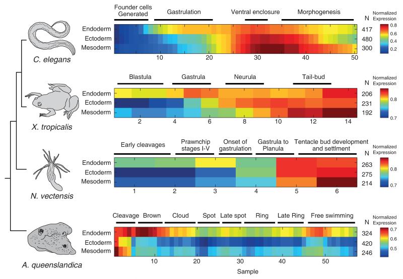 Figure 3. The endoderm expression program precedes the ectoderm program in diverse speciesExpression of germ layer genes in C. elegans, and their orthologs in X. tropicalis, N. vectensis, and A. queenslandica. The average is computed on the maximum-normalized gene profiles.
