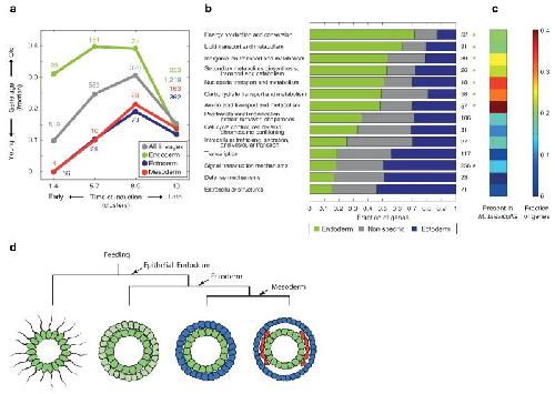Figure 4. The germ layers exhibit distinct gene ages and functional category enrichmentsa, Fraction of ‘old’ genes – defined as presence of orthologs in other opisthokont Eukaryotes – across the indicated temporal induction clusters and germ layers. Different gene age thresholds show similar results (Extended Data Fig. 6). b, For the shown functional categories, the bars indicate the fraction of genes in the endoderm gene set, ectoderm gene set, and other dynamic and zygotically expressed genes. Asterisks indicate significant endoderm (green) and ectoderm (blue) enrichments (P<0.01, Hypergeometric distribution). c, The fraction of orthologs in M. brevicollis is indicated for each functional category. d, A model for germ layer evolution.
