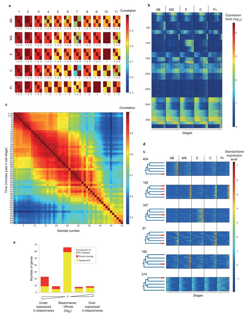 Extended Data Figure 2. A transcriptomic survey of C. elegans embryonic founder cell lineagesa, Replicates of the embryonic blastomere time-courses. The heatmaps show the correlations among the replicates for each blastomere lineage at each of the eleven examined stages. For three blastomere/stages there were no replicates. The median correlation coefficient is 0.9. Samples were collected in triplicates. Only samples with at least 750,000 reads were used which has been previously shown to be of sufficient sequencing depth for CEL-Seq12. Supplementary Table 3 provides the sequencing statistics for each sample. b, Expression profiles of the 3,910 dynamic genes across the blastomere lineage time-courses. See methods for definition of dynamic genes. c, Correlation coefficients between samples of the whole embryo time-course. Each of the 50 samples comprises a single embryo, collected at the indicated minutes past the 4-cell stage. Again, only samples with at least 750,000 reads were used and Supplementary Table 3 provides the sequencing statistics for each sample. d, The expression profiles of the 1,664 genes with differentiated expression analyzed in Figure 1c. Each profile was “standardized” by subtracting its mean and dividing by its standard deviation. e, Comparison of the blastomere time-courses to the EPIC dataset15. For 115 genes, we could compare gene expression to previously published embryonic expression profiles generated by microscopic lineaging until the ~300-cell stage15,39. Of these, 75% of our profiles had consistent localized expression (Supplementary Table 1). Of those, 54% matched completely, and 21% of the genes, expressed in all of the lineages in our dataset had some missing expression in the EPIC dataset because the lineaging was not carried out until the end of the developmental process. The remaining genes have some overlap in expression. Such differences in expression could be caused by the transgene in the EPIC dataset not recapitulating the profile of the endogenous gene, or missing signals between cells in the blastomere dataset, as is seen from the whole embryo/blastomeres expression level ratio (See Supplementary Table 1, ratios defined as equal, slightly higher/lower or much higher/lower). Expression profile compared to the EPIC dataset deviates more when expression in the blastomeres is low compared to the whole embryo, but the blastomere dataset has the advantage that all genes are assayed simultaneously, no transgenes are used, maternal transcripts are seen, and down-regulation of genes is observable.