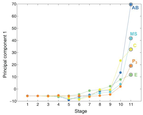 Extended Data Figure 4. The first principal component correlates with developmental timePrincipal components analysis as described in Figure 2a. Color codes are same as in Figure 1. PC1, PC2 and PC3 capture 18%, 12% and 11%, respectively, of the variation in the expression, respectively, in the 1,320 dynamically expressed genes with no expression in the first stage (to exclude genes with maternal expression).