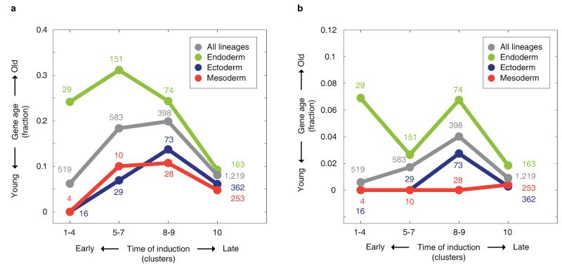 Extended Data Figure 6. Robustness of gene age analysisa, Same format as Figure 4a but with the definition of old genes as those present in at least 25% of the examined Eukaryotes (see Methods) that are not Ophisthokonts. b, Same as Figure 4a with a definition of “old” as those present in 25% of the examined organisms that are not Eukaryotes (Eubacteria and Archaea).