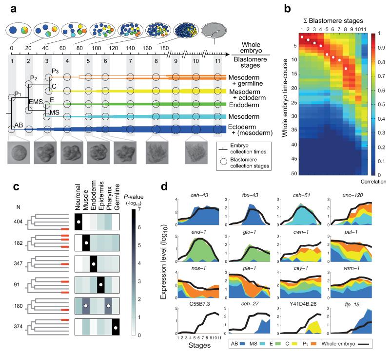 Figure 1. Determining the expression profiles of the C. elegans embryonic founder cell lineagesa, Sample collections are indicated for the shown C. elegans blastomere lineages (circles, Extended Data Fig. 1 and Extended Data Table 2) and whole embryos (notches, in minutes). b, Heat map showing Pearson’s correlation coefficients among the transcriptomes of the whole embryo and the sum of the individual blastomere lineages. White circles indicate pairs of blastomere stages and embryonic time-points expected to be most similar (Extended Data Table 2). c, P-values of enrichment across curated lists of genes for the indicated lineage-specific gene expression clusters (Extended Data Table 3 and Extended Data Fig. 2d). The white circles indicate the expected differentiation of each expression cluster (Extended Data Table 1). d, Spatial and temporal gene expression profiles.