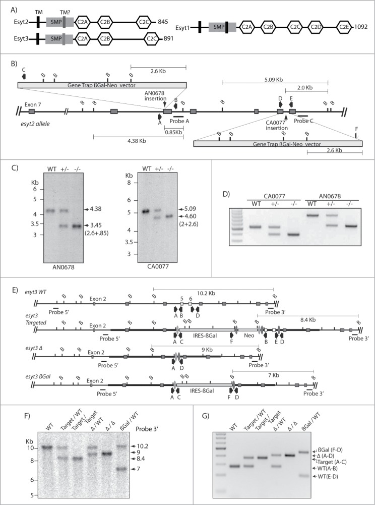 The Extended Synaptotagmins (Esyts) are a family of multi-C2 domain membrane proteins with orthologs in organisms from yeast to human. Three Esyt genes exist in mouse and human and these have most recently been implicated in the formation of junctions between endoplasmic reticulum and plasma membrane, as well as the Ca(2+) dependent replenishment of membrane phospholipids. The data are consistent with a function in extracellular signal transduction and cell adhesion, and indeed Esyt2 was previously implicated in both these functions in Xenopus. Despite this, little is known of the function of the Esyts in vivo. We have generated mouse lines carrying homozygous deletions in one or both of the genes encoding the highly homologous Esyt2 and Esyt3 proteins. Surprisingly, esyt2(-/-)/esyt3(-/-) mice develop normally and are both viable and fertile. In contrast, esyt2(-/-)/esyt3(-/-) mouse embryonic fibroblasts display a reduced ability to migrate in standard in vitro assays, and are less resistant to stringent culture conditions and to oxidative stress than equivalent wild type fibroblasts.