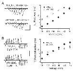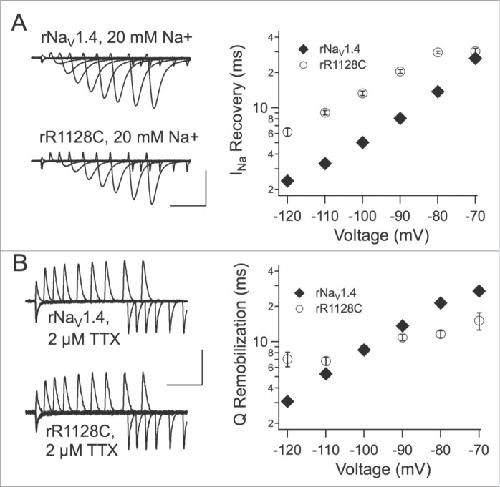 Figure 3. Recovery and charge remobilization in wild type rNaV1.4 and R3C channels, following closed-state fast inactivation with depolarization to −40 mV. (A) Traces of recovery of ionic current with −90 mV hyperpolarizing commands and test at −20 mV, with voltage-dependence shown at right. (B) Traces and voltage dependence of the slow component of charge remobilization in experiments after TTX block, using 0 mV test. Calibration for traces: vertical 1–2 μA (A), 400 nA (B); horizontal 10 ms. Values represent mean ± SEM from 16 to 21 (rNaV1.4) or 8 to 10 (rR1128C) experiments.