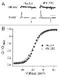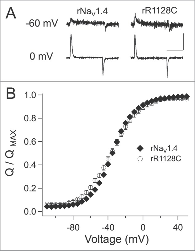 Figure 2. Charge movement in wild type rNaV1.4 and rR1128C channels. (A) Traces comparing responses at −60 mV and at 0 mV, from a holding potential of −120 mV. Calibration: vertical 100 nA (−60 mV) or 500 nA (0 mV); horizontal 10 ms. (B) Voltage dependence of charge movement (Q/V relation) in response to 20 ms depolarization, from −110 mV to 60 mV. Values represent mean ± SEM from 34 (rNaV1.4) or 18 (rR1128C) experiments.