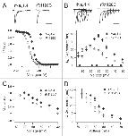 Figure 1. Closed-state fast inactivation in rNaV1.4 and R3C channels. (A) Steady-state availability: channels were conditioned for 300 ms at voltages from −120 mV to 25 mV, prior to test at −20 mV. Traces show test responses following conditioning at −120 mV (solid line) or −60 mV (dotted line), with voltage dependence below. B. Kinetics of sodium current inactivation; channels were conditioned at voltages from −85 mV to −30 mV for variable duration, prior to test at −20 mV. Traces show responses for selected sweeps up to 25 ms conditioning at −60 mV. Plots of voltage dependence are shown below, with arrows representing fast inactivation ranges of recovery, closed-state entry, and open-state entry for wild type rNaV1.4. Calibration for A, B: vertical 2 μA; horizontal 10 ms. (C, D). Charge movement from experiments as in (B) after block of ionic current with 2 μM TTX. Normalized charge (Q/QMAX) after 300 ms conditioning is shown in (C), with kinetics of charge decrement shown in (D). Values represent mean ± SEM from 10 to 29 (rNaV1.4) or 11 to 32 (rR1128C) experiments.