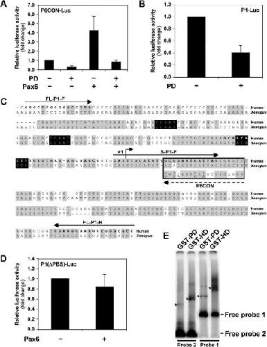 Figure 2. Pax6 paired domain mediates direct autoregulation of promoter P1. (A) An isolated Pax6 paired domain (PD) inhibits the function of full-length Pax6 in dominant negative manner. HEK-293 cells were transiently transfected with 2 μg of P6CON-Luc in combination with 5 μg of Pax6 or PD. Cells were lysed 48 h post-transfection and luciferase assays were performed. The data represent mean +/−SEM (n = 3). (B) Dominant negative paired domain (PD) inhibits the basal activity of promoter P1 indicating an autoregulatory component. HEK-293 cells were transiently transfected with 2 μg of P1-Luc in combination with 5 μg of PD. Cells were lysed 48 h post-transfection and luciferase assays were performed. The data represent mean +/−SEM (n = 5). (C) Alignment of the human and Xenopus Pax6 P1 promoters reveals an evolutionary conserved putative paired domain-binding site. Sequences of the human and Xenopus Pax6 P1 promoters were aligned in the region corresponding to the reporter construct P1-Luc. This alignment was then aligned to the consensus-paired domain binding sequence, P6CON, which is boxed (Note: this is the reverse-complement P6CON sequence as the putative binding site is encoded 5′ to 3′ on the opposite strand). A broken arrow indicates orientation of the P6CON consensus. Nucleotides matching the majority sequence are shaded in grey, while the TATA and CCAAT boxes are shaded in black. Bold letters indicate the location of PCR primers used to generate DNA probes for gel-shift assays, and solid lines indicate primer orientation. Human transcription start site is indicated as +1. (D) Deletion of a putative paired domain binding site in promoter P1 (P1(▵PBS)-Luc) disrupts Pax6 autoregulation. HEK-293 cells were transiently transfected with 2 μg of P1(▵PBS)-Luc in combination with 5 μg of Pax6. Cells were lysed 48 h post-transfection and luciferase assays were performed. The data represent mean +/−SEM (n = 5). (E) Gel mobility shift assay of GST-Pax6-PD and GST-Pax6-HD binding to the P1 promoter. Equal amounts of GST-Pax6-PD and GST-Pax6-HD were used as described in the materials and methods. Probe 1 was amplified using the PCR primers FL-P1-F and FL-P1-R, and Probe 2 using S-P1-F and FL-P1-R as indicated in the P1 sequence shown in Figure 2C. The actual primer sequences used here are provided in the materials and methods. The migration of the major shifted bands is indicated as (*).