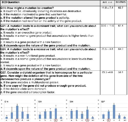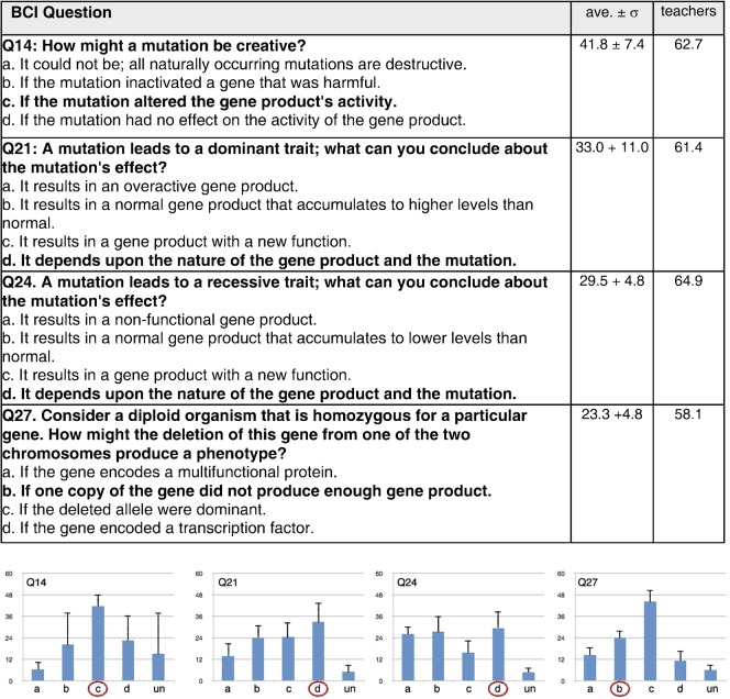 Fig. 1. BCI based insights into student “genetic” thinking.The table (top) illustrates the overall correct responses (in bold) to four questions from the BCI. The graphs (below) and the right two columns of the table reflect responses to these same questions by a group of fourteen introductory college level biology classes (a total of 2197 students) at seven different colleges and universities, administered over the period from 2006 to 2011, together with the responses from a group of 85 middle and high school teachers who answered the BCI online in response to an email to the National Science Teachers Association biology listserv. The graphs display the responses to the questions (a,b,c,d and unanswered “un”) together with the standard deviation for each response. The correct choices are indicated by red circles.