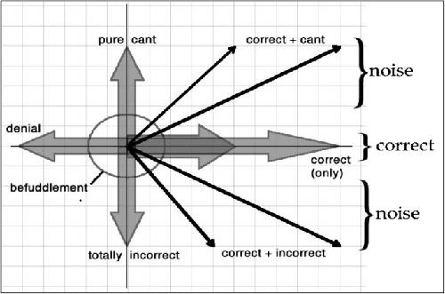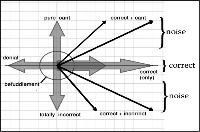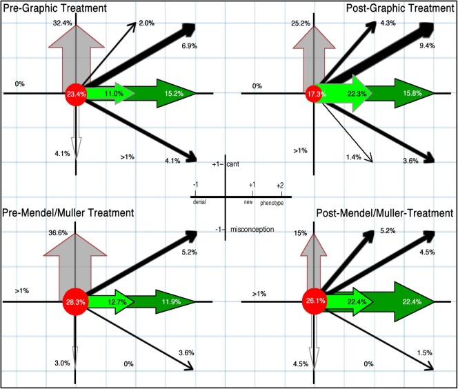 Fig. 2. Vector analysis of student responses.This illustrates our scheme for visualizing the clarity, correctness, and confusion present in student responses. The widths of arrows (and the diameter of the circle centered around 0,0) reflect the number/percentage of students in that group. Arrows that fall off the X axis contain aspects of correctness and either cant or mistakes.
