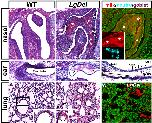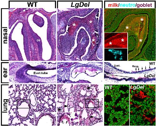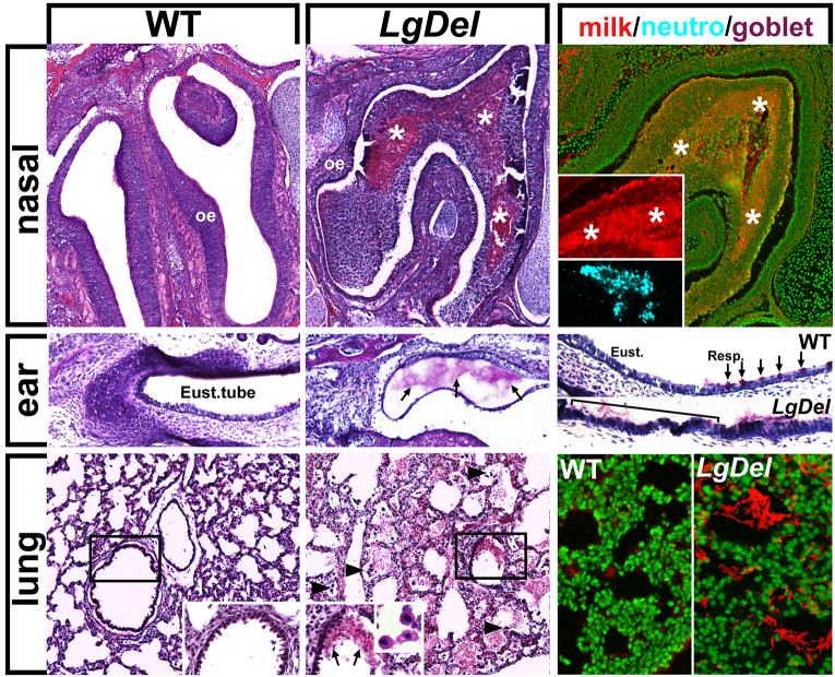 Fig. 2. P7 LgDel mice show signs of dysphagia, including nasal, ear and lung milk-aspiration inflammation or infection. Top row: aspiration-related protein aggregates adjacent to the turbinates of the olfactory epithelium (oe) in P7 WT and LgDel pups. The protein aggregates (asterisks), seen only in LgDel pups, contain murine milk protein (far right; fluorescent Nissl stain, green; immunolabel for milk protein, red) as well as neutrophils (anti-CD64, blue). Middle row: mucus aggregates are seen in the Eustachian tubes of LgDel P7 pups, accompanied by an apparent increase in the frequency of mucus-producing goblet cells (bracket/arrows, far right panel; PAS stain) at the boundary of the pharynx (Resp.; arrows) and Eustachian (Eust.; bracket) tube epithelium. Bottom row: LgDel lungs have more frequent evidence of inflammation and/or infection, including red blood cell aggregates (arrows, middle insert), macrophages (arrowheads, and inset, middle) and infiltration of murine milk protein (far right panel; green, fluorescent Nissl stain; red, milk protein immunolabel).