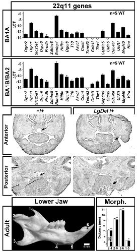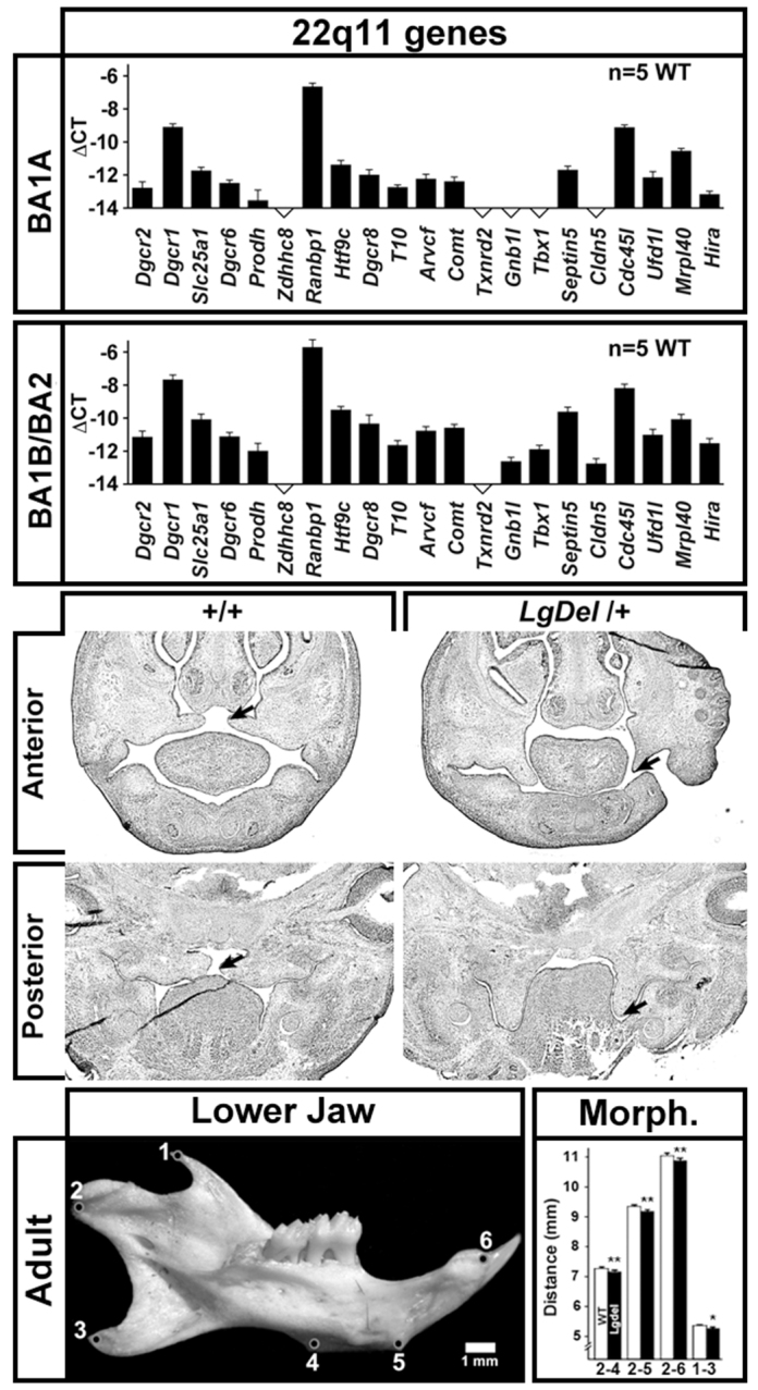 Fig. 3. Altered palate and jaw morphology in LgDel mice. Top: quantitative real time PCR (qPCR) analysis of a subset of 22q11 deleted genes in microdissected rudiments of key orofacial structures for feeding and swallowing: BA1A, which includes the maxilla, which gives rise to the upper jaw, mouth structures and some muscles of mastication, and BA1B/BA2, which includes the mandible and hyoid, which gives rise to the lower jaw and some pharyngeal structures. These 22q11 genes were chosen based upon expression above a threshold level â 0.01% of Gapdh expression measured in the same sample â in a previous analysis of developing E10.5 embryos or the brain from E12.5 onward (Maynard et al., 2003). Expression was quantified. Middle: sections through the anterior and posterior palatal region in E13.5 WT and LgDel embryos demonstrating failure of palatal elevation in the LgDel (compare arrows). The palate has not fused in either the WT or LgDel at this age. WT palatal shelves are more frequently elevated (left arrows) than those in the LgDel (right arrows). Bottom left: lateral view of the mandibular process from a WT mouse, with reference points for measurements indicated as numbers 1â6. Bottom right: morphometry of point-to-point distances between cardinal locations shown at left indicates that mandibular growth is diminished in LgDel versus WT littermate mice (*Pâ¤0.5; **Pâ¤0.01, t-test; n=48 LgDel, 46 WT).