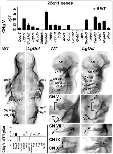 Fig. 5. CN development is altered in E10.5 LgDel embryos. Top: 16 out of 21 22q11 deleted genes are expressed above threshold in CNg V, based upon qPCR analysis of microdissected WT E10.5 CNg V samples. Middle left: a representative E10.5 WT embryo labeled immunocytochemically for neurofilament protein shows the E10.5 WT hindbrain and associated cranial nerves (CN) and ganglia (CNg). In the LgDel (right), CNg V and VII appear more closely spaced (arrow), their motor roots less differentiated (asterisks), and, parallel to E9.5, the anterior hindbrain appears compressed. In addition, CNg IX and X appear fused in the LgDel (arrows). Bottom left panel: expression changes in LgDel CNg V determined by qPCR of microdissected ganglia from LgDel versus WT E10.5 embryos. Robo2 (black bar) is significantly increased (P≤0.03) and L1cam (gray bar) shows a significant trend toward increased expression (P≤0.06). Middle right: (left) a lateral view of typical WT axon trajectories and fasciculation as well as the position of cranial sensory ganglia for a subset of CNs. (Right) CN development is altered in an E10.5 LgDel embryo (asterisks). CN V appears sparse and de-fasciculated, the normal bifurcation of CN VII is not evident, and the ganglia of CN IX and X are fused. Middle bottom right: specific CN phenotypes in LgDel embryos. These examples, from additional WT and LgDel embryos, are representative of the features scored for quantitative phenotypic analysis. First row: the ophthalmic (op, arrow), maxillary (mx, bracket) and mandibular (md, arrows) branches of CN V appear dysmorphic in LgDel E10.5 embryos. Second row: the bifurcation (arrows) of CN VII that prefigures its division into multiple dorsal and ventral branches, including the chorda tympani, is frequently not evident in LgDel embryos. Third row: the sensory ganglia of CN IX/X and their immediate distal branches are frequently fused in LgDel embryos (compare arrows in left and right panels).