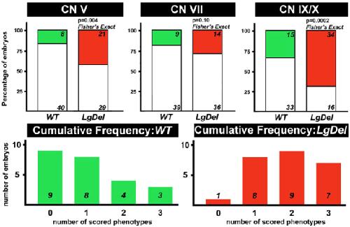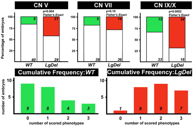 Fig. 6. Statistically significant changes in phenotypic frequency in developing CN V, IX and X in LgDel versus WT embryos. Top panels: histograms showing the proportion of WT (green) and LgDel (red) embryos with each of the three phenotypes scored (CN V, VII and IX/X). Statistical significance determined using Fisher’s exact analysis. The CN V and IX/X phenotypes occur at significantly greater frequency than in the WT; the CN VII phenotype does not. Lower panels: frequency of single or multiple CN phenotypes in WT and LgDel embryos. Overall phenotypic frequency is substantially increased in LgDel mice, as is the number of individual embryos showing multiple (two or three) CN phenotypes.