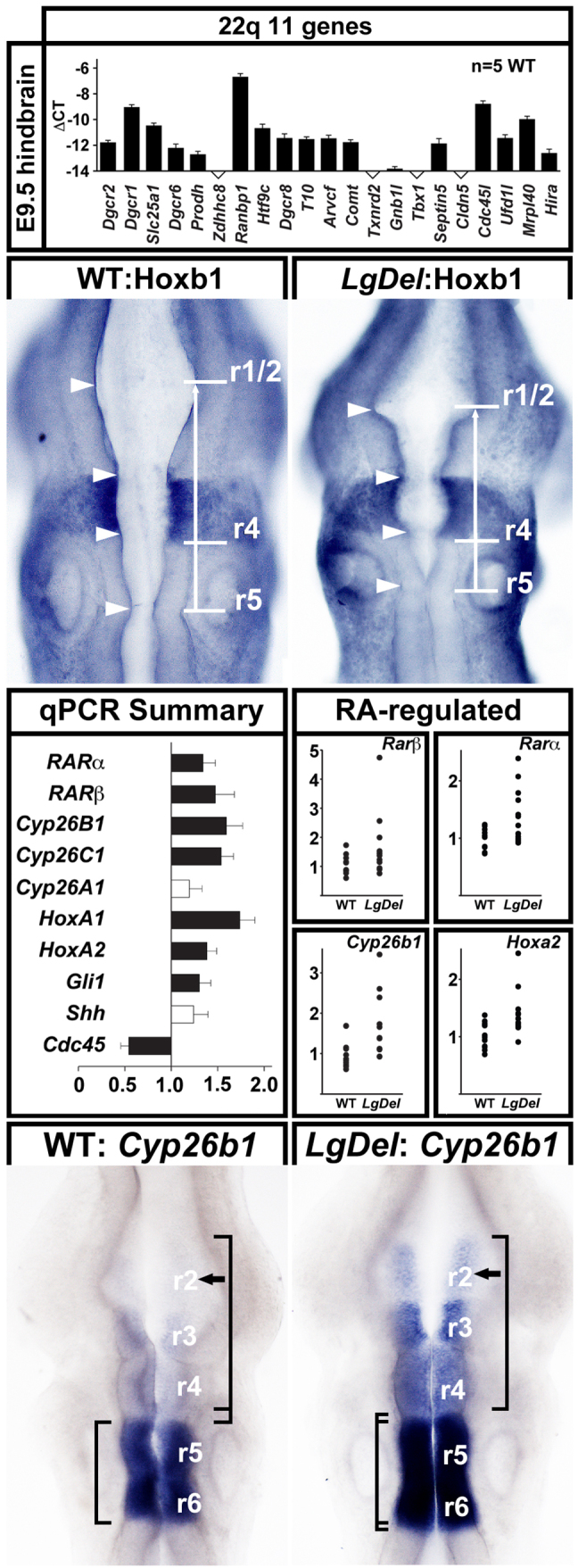 Fig. 4. Altered gene expression, morphogenesis and patterning in the LgDel E9.5 anterior hindbrain. Top: qPCR analysis of 22q11 gene expression above threshold levels in the microdissected E9.5 hindbrain (r1 to r8). 16 out of 21 candidates are expressed above threshold. Note that Tbx1, a key 22q11 candidate gene for cardiovascular phenotypes, is not detected in the E9.5 hindbrain. Middle top: apparent pattern changes and dysmorphogenesis in the E9.5 anterior hindbrain. The distance between r4 and r1/2 in the WT, defined by Hoxb1 and En1 immunolabeling (left) is greater than that in the LgDel (right; compare white bars and arrow), and the dorsal margins of the neuroepithelium appear deformed (compare arrowheads). Middle bottom left: summary of qPCR analysis of expression of several genes that distinguish posterior (top) from anterior (bottom) rhombomeres in the E9.5 microdissected hindbrain (r1 to r8). Middle bottom right: scatterplots of expression levels in individual hindbrain samples of four RA-regulated genes – two found in posterior rhombomeres (Rarα, Rarβ), two with distinctly patterned expression in both anterior and posterior rhombomeres (Cyp26b1, Hoxa2). Bottom: (left) in the WT E9.5 hindbrain, Cyp26b1 is expressed at high levels in r5/6, lower levels in r3/4 and is barely detectable in r2. (Right) In the LgDel E9.5 hindbrain from an embryo hybridized concomitantly with the WT at left, Cyp26b1 is increased in r5/6, significantly stronger in r3/4 and is now clearly detectable in r2 (compare arrows, left and right). In addition, r5/6 boundaries have expanded in the LgDel (compare left brackets), and r2 to r4 have contracted (compare right brackets).