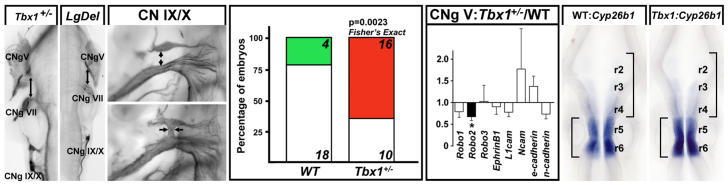 Fig. 7. Heterozygous Tbx1 mutation yields a CN IX/X phenotype parallel to that in E10.5 LgDel embryos. Left: the ganglia of CN IX and CN X are more frequently connected by axon fascicles or fused (arrows) in E10.5 Tbx1+/− embryos than WT littermates. Middle left: quantitative analysis of CN phenotypes shows a statistically significant CN IX/X phenotype with the same frequency in Tbx1+/− embryos as in LgDel embryos. Middle right: qPCR measurement of gene expression in the CN V ganglion of E10.5 Tbx1+/− embryos, normalized to WT littermate control levels. Robo2 (black bar), which increases significantly in the LgDel (see Fig. 5), decreases significantly in the Tbx1+/− CN V ganglion (asterisk). Right: Cyp26b1, which, in WT, is expressed at high levels in r5/6, lower levels in r3/4 and barely detectable in r2, has a similar pattern of expression in r6 through r2 in Tbx1+/− embryos. There is no noticeable expansion of r5/6 (compare brackets left) or compression of r2 to r4 (compare brackets right).