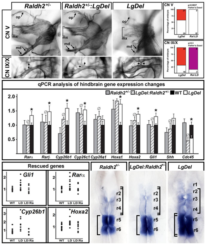 Fig. 8. Heterozygous inactivation of Raldh2 rescues CN V, but not CN IX/X, phenotypes in LgDel embryos. Top left: (first row) comparison of CN V differentiation in E10.5 Raldh2+/−, which resembles the WT (see Fig. 5), Raldh2+/−:LgDel, which also resembles the WT, and LgDel, which shows clear disruption of fasciculation and differentiation of all major branches of CN V. The ophthalmic (op, arrow), maxillary (mx, bracket) and mandibular (md, arrows) branches of CN V are shown. (Second row) Comparison of CN IX/X differentiation in E10.5 Raldh2+/−, Raldh2+/−:LgDel and LgDel embryos. CNs in Raldh2+/− embryos resemble the WT, whereas Raldh2+/−:LgDel and LgDel have similar ganglion fusions (arrows) and disrupted axon trajectories. Top right: frequency of phenotypes in 12 individual CN V and CN IX/X from six E10.5 Raldh2+/−:LgDel, or from six LgDel embryos. Statistical comparisons made using Fisher’s exact analysis. Middle: A-P rhombomere selective genes, many of which are RA regulated (see Fig. 4), return to WT levels in E9.5 LgDel:Raldh2+/− hindbrains, based upon qPCR analysis of microdissected hindbrain samples from n=8 Raldh2+/−; 7 LgDel:Raldh2+/−; 13 WT; and 12 LgDel embryos. Ø: genes for which LgDel:Raldh2+/− levels are statistically indistinguishable from WT and Raldh2+/− levels; *: genes for which LgDel levels are significantly increased over both Raldh2+/− and WT. Bottom left: scatterplots showing the ranges of individual hindbrain expression values for four ‘rescued’ genes in WT, LgDel (LD) and LgDel:Raldh2+/− (LD:Ra). The minimum and maximum values in the WT and LgDel:Raldh2+/− are similar, and the minimum and maximum values for the LgDel are consistently increased. Bottom right: Cyp26b1 patterns in the Raldh2+/− hindbrain are similar to WT (compare to WT panels in Figs 4 and 7); those in LgDel:Raldh2+/− hindbrain resemble the Raldh2+/− and WT as well; in the LgDel, intensity increases in r6, r5, r4 and r3, the barely detectable expression in r2 is more robust, and, in this case, apparently extends into r1. Right hand brackets show expansion of r5/6 in LgDel but not Raldh2+/− or LgDel:Raldh2+/− hindbrain; left brackets show that r2-r4 are apparently compressed in the LgDel but not Raldh2+/− or LgDel:Raldh2+/− hindbrain.