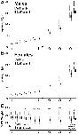 Fig. 1. Growth curves for LgDel and WT littermate males and females from P1 through P30. (A) Growth curves for male LgDel and WT littermates, weighed daily from P1 through P7, then weekly from P7 through P28 (x-axis). (B) Growth curve for female LgDel and WT littermates. (C) Normalized mean weights for male and female LgDel and WT littermates. The boxes represent standard errors of each mean (s.e.m.), and bars reflect standard deviations for each data point. Growth curves were compared by ANOVA (A,B), and mean normalized values compared using Mann-Whitney analysis (C).