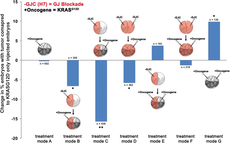 Figure 2. Selective disruption of gap junctional communication (GJC) reduced tumor incidence. To determine the effect of GJC disruption on tumorigenesis, H7 and KRASG12D injections—aimed at disrupting GJC host-wide, within tumors, and away from tumors—were performed. Compared to KRASG12D-only injected embryos (treatment mode A), treatment modes B and D showed significant decrease in % embryos with tumor by 6.6 and 5.8%, respectively, implying that H7 contralateral to the oncogene has no effect if there is H7 ipselateral to the oncogene. Contralateral H7 only (treatment mode C) significantly reduces the % embryos with tumor by 15.8%. Doubling the level of oncogene injected along with host-wide introduction of H7 (treatment mode F) does not affect tumor incidence when compared to oncogene-only (one side) injected embryos (treatment mode A), but is able to counter the 9.9% increase in tumor incidence resulting from excess oncogene introduced (treatment mode G) down to the tumor incidence level of one-side oncogene injection. Similarly, tumor incidence from the excess oncogene introduction can be reduced by H7 introduction to either side of the embryo (treatment mode E). *P < 0.05, **P < 0.001; t-test. |