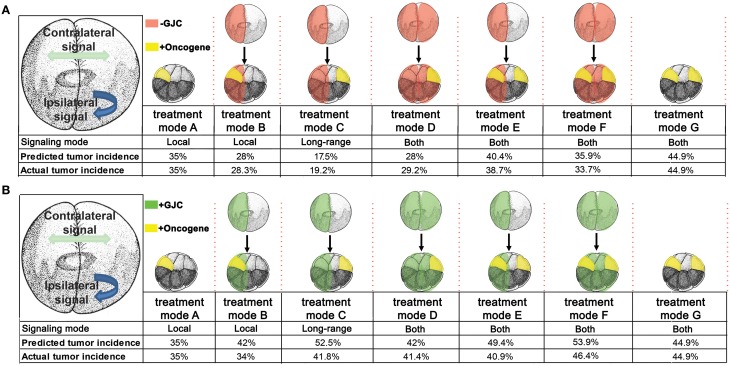Figure 3. Enhanced gap junctional communication (GJC) through connexin 26 (Cx26) overexpression increases tumor incidence. To determine the effect of GJC disruption on tumorigenesis, Cx26 and KRASG12D injections—aimed at enhancing GJC host-wide, within tumors, and away from tumors—were performed. Compared to KRASG12D-only injected embryos (treatment mode A), long-range and host-wide Cx26 treatment modes (C, D, F) show an increase in the number of embryos with tumor by 6.4 to 11.4%. However, treatments involving the expression of oncogene and Cx26 on the same side (treatment modes B and E), while non-significant, lower tumor incidence when compared to treatment modes A and F, respectively. *P < 0.05; t-test. |
