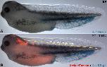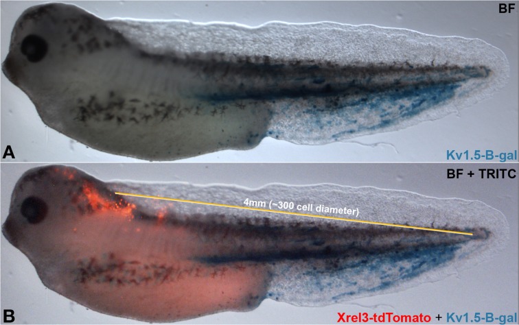 Figure 8. Long-range signaling in the frog embryo. Oncogene-expressing cells (red, Xrel3-tdTomato) are prevented from forming tumors by hyperpolarizing channel-expressing cells (Kv 1.5-β-gal) located at a distance. Compare (A) without to (B) with Xrel3-tdTomato. The ~4 mm distance from the center of the tdTomato signal to the farthest point on the tail expressing β-gal was estimated to be ~300 cell diameter (average single cell diameter of 13.3 μm). |