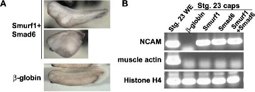Figure 1. Smurf1 and Smad6 synergistically inhibit endogenous BMP signaling in Xenopus embryos. (A) Smad6 (500 pg) and Smurf1 (500 pg) RNAs were injected near the ventral midline of four-cell embryos. Resultant phenotypes are shown (top, secondary axis; middle panel, hyperdorsalized embryo). When 1000 pg of β-globin RNA was injected, embryos developed normally (bottom). (B) RNAs encoding β-globin (1000 pg), Smurf1 (1000 pg), Smad6 (1000 pg), or Smurf1 (250 pg) and Smad6 (250 pg) were injected near the animal pole of two-cell embryos. Animal caps were isolated from embryos at blastula stage 8 and cultured to stage 23. RNAs were extracted from pooled caps and control embryos and subjected to RT-PCR analysis. WE, whole embryo.