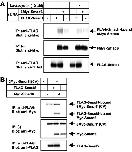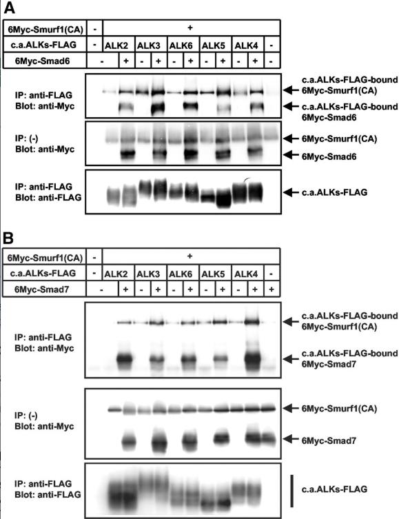 Figure 3. Smurf1 interacts with BMP type I receptors via I-Smads. Binding of Smurf1 to different type I receptors for BMPs in the presence of Smad6 (A) or Smad7 (B) was examined. COS7 cells were transfected with FLAG-tagged constitutively active forms of type I receptors for the TGF-β superfamily proteins (c.a.ALK2-FLAG, c.a.ALK3-FLAG, and c.a.ALK6-FLAG for BMPs; and c.a.ALK5-FLAG and c.a.ALK4-FLAG for TGF-β and activin) and 6Myc-tagged Smurf1(CA) in the presence or absence of 6Myc-tagged Smad6 (A) or 6Myc-tagged Smad7 (B). Cell lysates were subjected to FLAG-immunoprecipitation (IP) followed by Myc-immunoblotting (Blot). The top panels show the interaction and the lower two panels the expression of each protein.