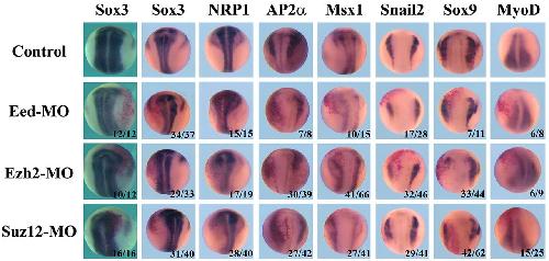 Fig. 2. PRC2 regulates neural and neural crest development. MOs (20â ng) against Eed, Ezh2 or Suz12 were injected unilaterally into two-cell-stage embryos. The embryos were examined at neurula stages by ISH for neural and neural crest markers. Knockdown of either one of the PRC2 proteins reduced the expression of the late neural marker NRP1 and the neural crest genes Snail2 and Sox9, but did not drastically decrease the expression of the early neural marker Sox3 (open neural plate stages, first column from left; late neurula stages, second column from left) or the neural plate border genes AP2α and Msx1. The mesodermal marker MyoD was not inhibited either. Numbers indicate embryos showing the displayed patterns (no reduction for Sox3, AP2α, Msx1 and MyoD, and decreased expression for NRP1, Snail2 and Sox9) over the total number of embryos analyzed.