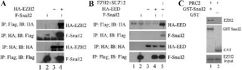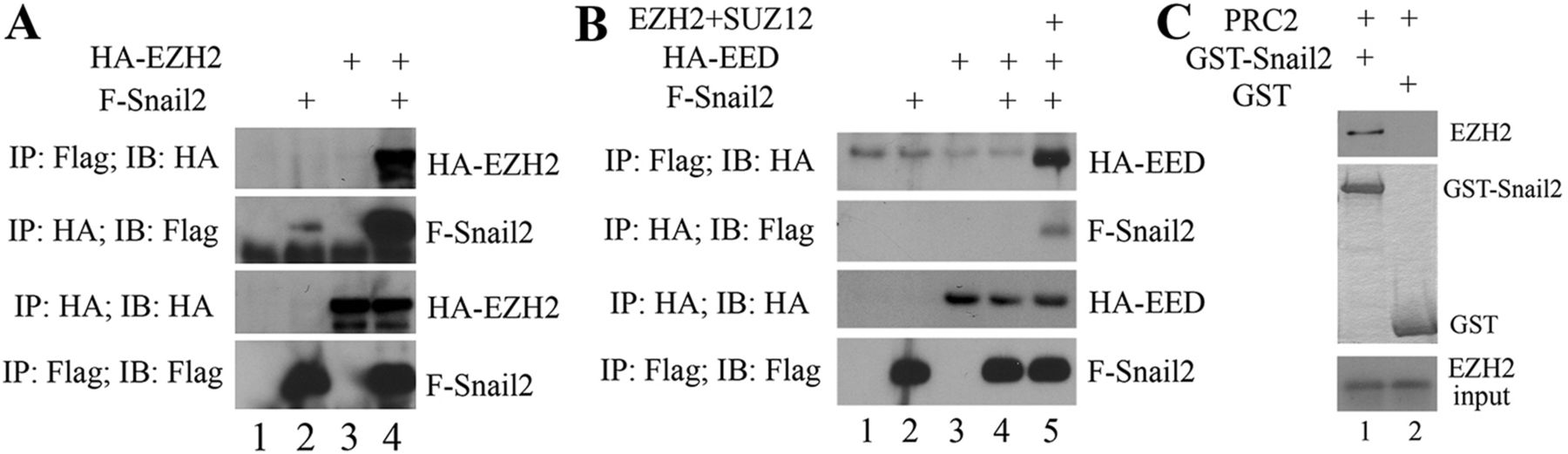 Fig. 3. EZH2 interacts directly with Snail2. RNAs (1-2â ng) encoding tagged and untagged PRC2 proteins and Flag-Snail2 were injected alone or together, and proteins were extracted at gastrula stages 10-11 for IP and western blot analyses. (A) Reciprocal co-IP assay demonstrated that HA-EZH2 interacts with Flag-Snail2 in Xenopus embryos. (B) HA-EED and Flag-Snail2 do not co-precipitate. However, in the presence of EZH2 and SUZ12, HA-EED was pulled down by anti-Flag antibody, indicating that Snail2 recruited the entire PRC2 complex. (C) Purified GST-Snail2, but not GST, pulled down commercially available purified EZH2 directly.