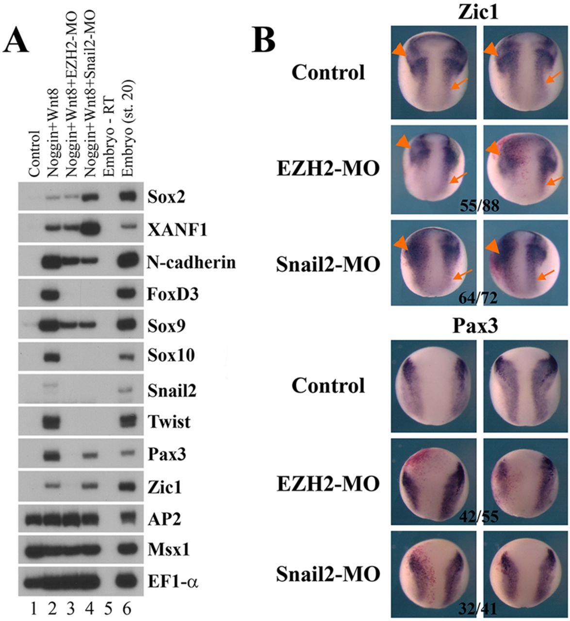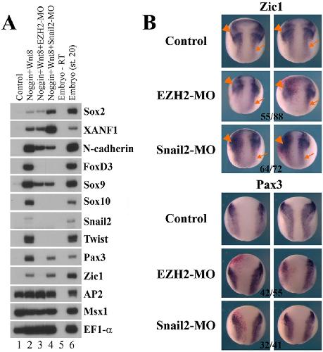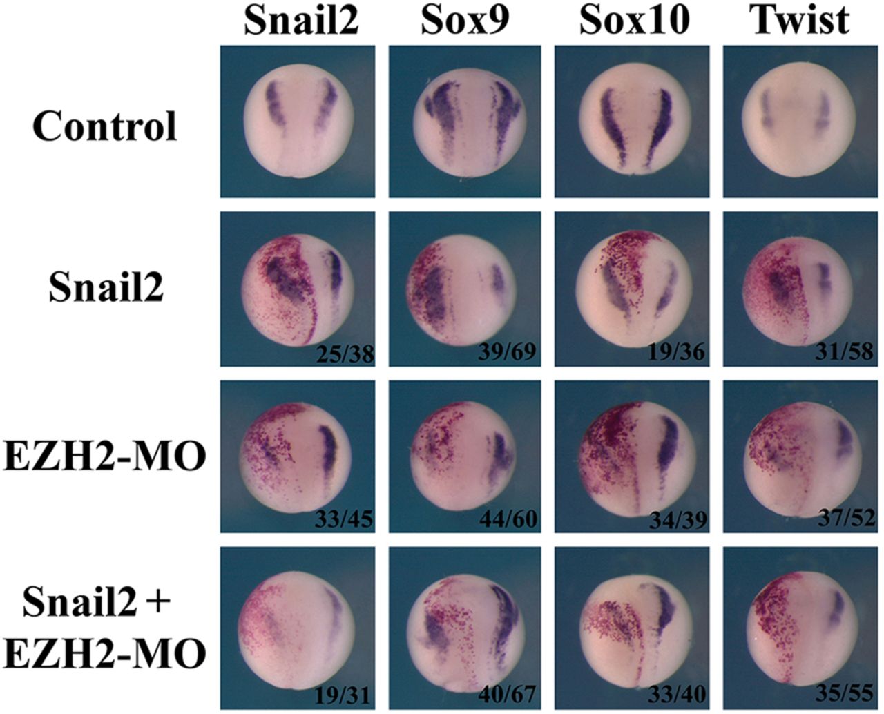 Fig. 4. Snail2 requires EZH2 to regulate neural crest markers. Snail2 RNA (0.15â ng) was injected alone or with 20â ng EZH2-MO unilaterally into two-cell-stage embryos. ISH performed at neurula stages 17-18 revealed that ectopic expression of Snail2 expanded domains of neural crest genes Snail2, Sox9, Sox10 and Twist. However, Snail2 failed to expand the domains of these genes in the presence of EZH2-MO, implying that neural crest expansion by Snail2 required EZH2 function. The numbers of embryos showing the displayed patterns over total embryos analyzed are shown.