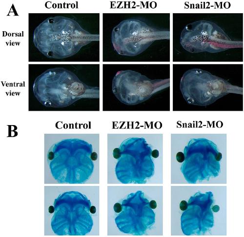Fig. 7. EZH2 regulates formation of craniofacial cartilages. 20â ng EZH2-MO or Snail2-MO was injected unilaterally into two-cell-stage embryos. The embryos were cultured to the tadpole stages for Alcian Blue staining of the craniofacial cartilages. (A) Knockdown of either EZH2 or Snail2 led to malformation of craniofacial structures on the injected side (labeled by Red-Gal staining). (B) Alcian Blue staining revealed that the neural crest-derived craniofacial cartilages (Meckel's, ceratohyal and ceratobranchial cartilages) were defective on the side injected with EZH2-MO or Snail2-MO (right side of the panels).