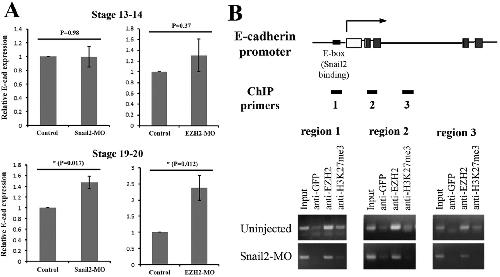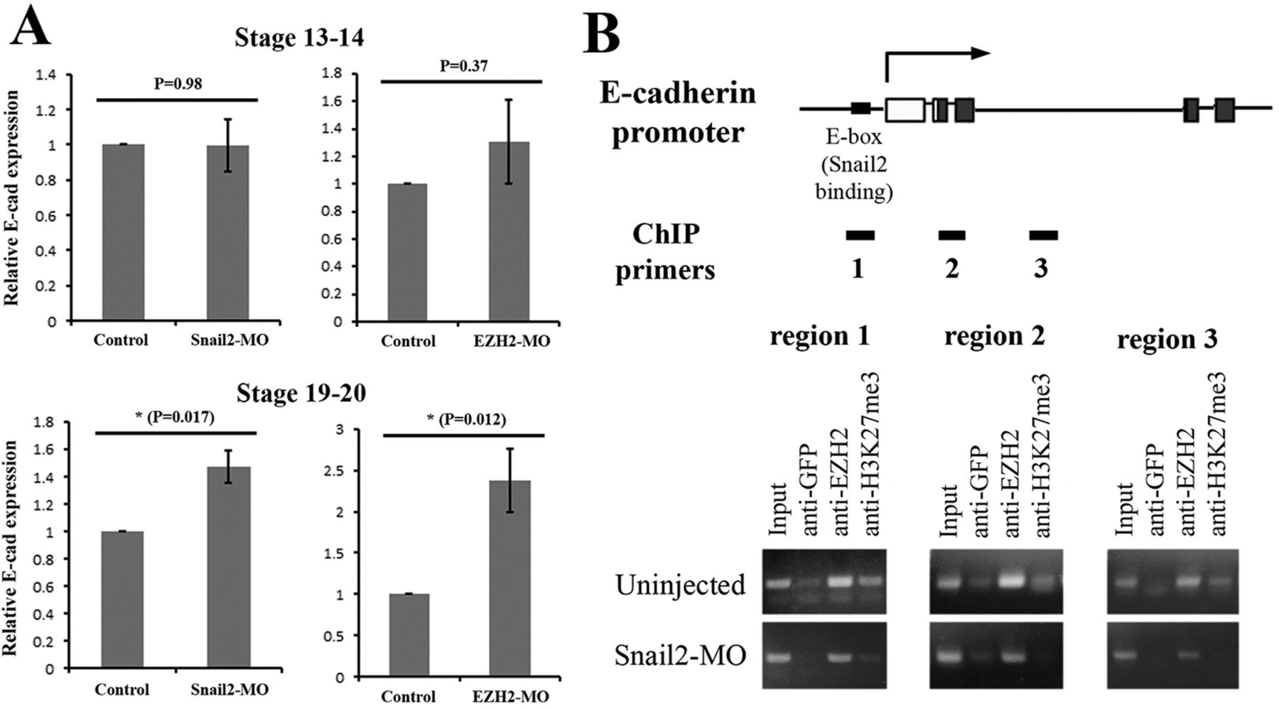 Fig. 8. Snail2 regulates EZH2 occupancy and H3K27me3 levels at the promoter of the Snail2 direct target E-cadherin during neural crest EMT. (A) Knockdown of Snail2 or EZH2 did not appreciably affect E-cad expression at early neurula stages 13-14, but resulted in increased E-cad expression at late neurula stages 19-20, when the neural crest underwent EMT to emigrate from the neural tube. Student's t-test revealed statistically significant changes in E-cad expression in morphant versus control samples at stages 19-20 (P<0.05). (B) Genomic structure around the E-cad promoter and the regions assayed in the ChIP experiments are shown at the top. Snail2-MO (20â ng) was injected into each blastomere of two-cell-stage embryos. Control and injected embryos were harvested at late neurula stages 19-20 for ChIP assay of EZH2 binding and H3K27me3 association with the E-cad promoter. Anti-GFP antibody was used as negative control. Knockdown of Snail2 reduced EZH2 occupancy and decreased H3K27me3 levels at the E-cad promoter, implying that Snail2 recruited EZH2/PRC2 to the E-cad promoter to deposit the repressive chromatin marks during EMT.