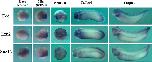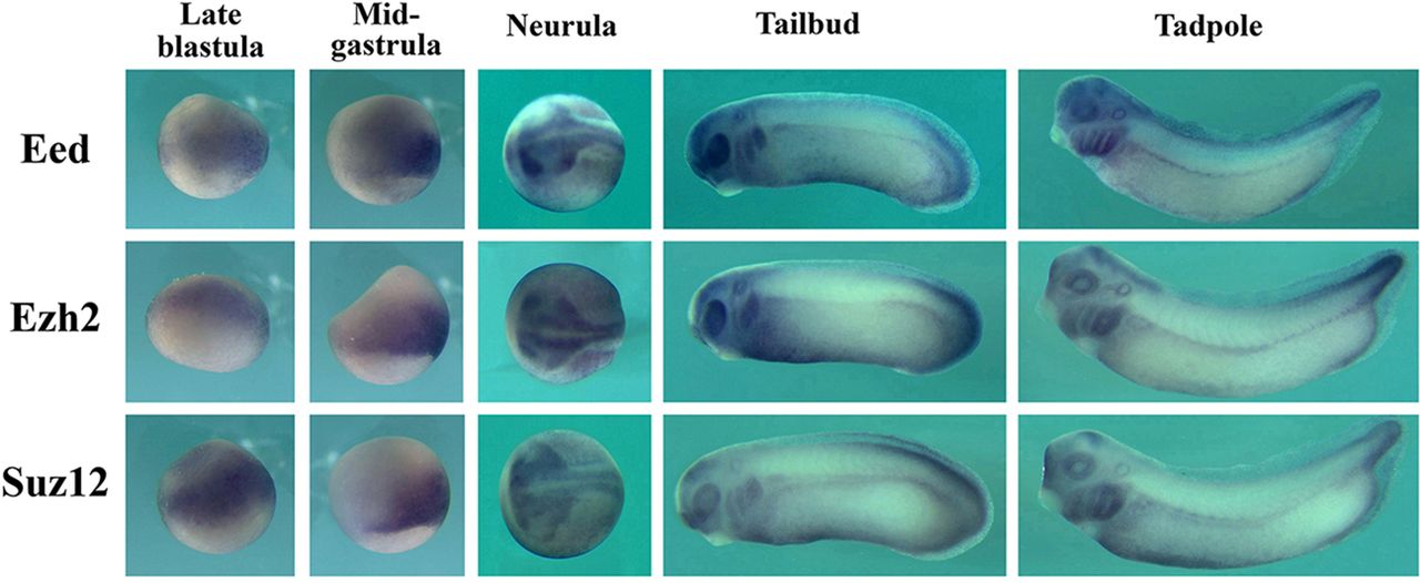 Fig. 1. Expression of the PRC2 core components during early Xenopus development. Eed, Ezh2 and Suz12 are expressed similarly in early Xenopus embryos. Their transcripts are detected in the pan-mesoderm in late blastulae and early gastrulae embryos, but are shifted to dorsal mesodermal and dorsal ectodermal cells at late gastrula stages. During neurulation, their RNAs are located in neural and neural crest cells. At tailbud and tadpole stages, these genes are expressed in neural, sensory organs and migrating neural crest cells.