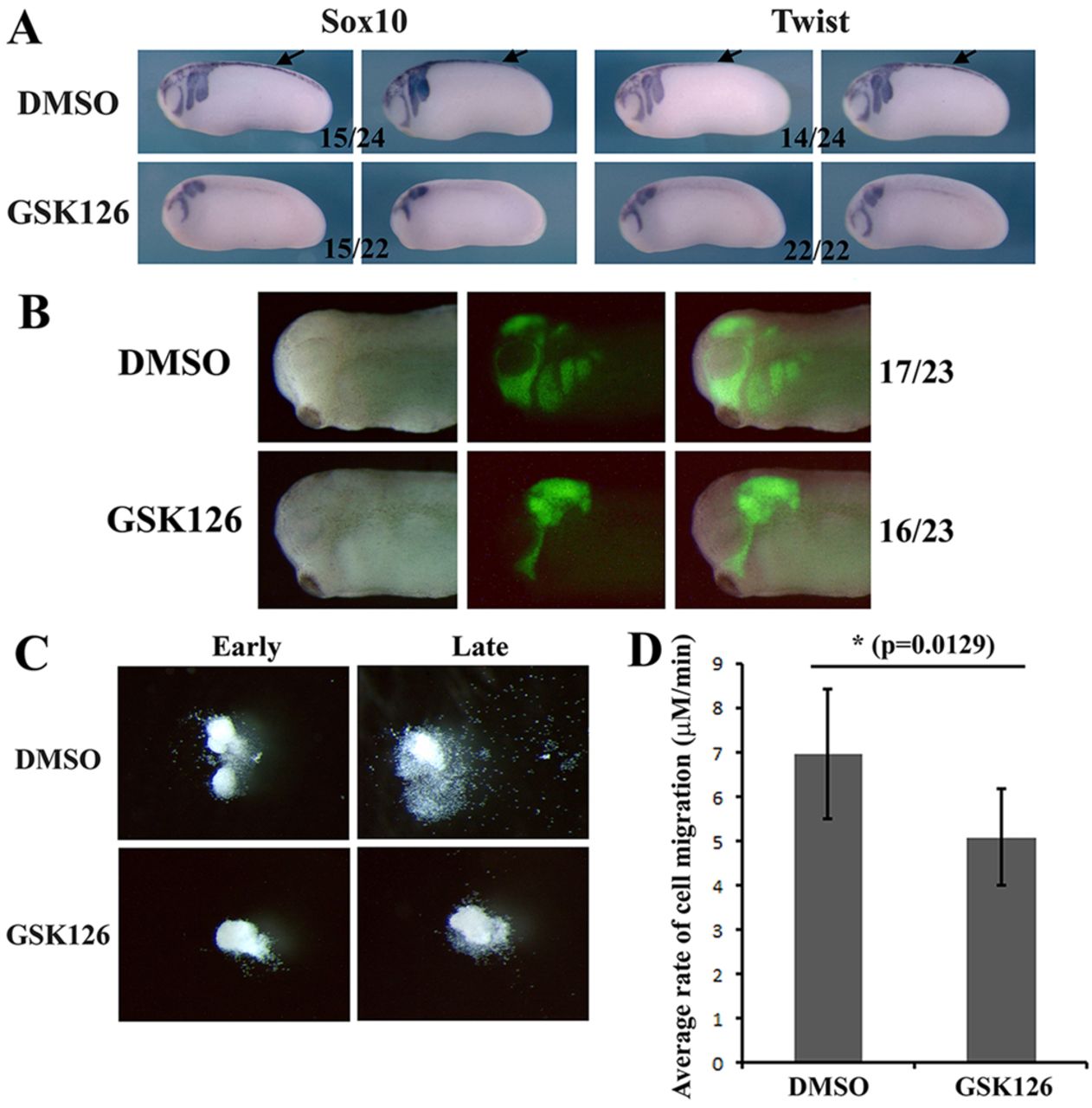 Fig. 6. EZH2 regulates neural crest migration. (A) Wild-type embryos were cultured in medium with DMSO or 50â µM EZH2 inhibitor GSK126 from stages 13-14 onward. The embryos were analyzed by ISH for Sox10 and Twist expression at tailbud stages 25-26. In DMSO-treated embryos, Sox10- and Twist-expressing cells migrated in distinct streams in the head. Treatment with GSK126 resulted in reduced migration of these cells. In addition, Sox10 and Twist expression in dorsal midline of the trunk (arrows) was eliminated by GSK126 treatment. (B) Neural crest tissues from fluorescein dextran-labeled donor embryos were transplanted into unlabeled control embryos at neurula stages 15-16. The embryos were cultured in medium with DMSO or 50â µM GSK126 until tailbud stages 26-28. Migration of the neural crest was examined by fluorescence microscopy. Whereas neural crest from DMSO-treated embryos migrated efficiently in the head, GSK126-treated embryos displayed defects in neural crest migration. (C) Neural crest explants were dissected from stage 15-17 embryos and cultured on fibronectin-coated dishes for about 16â h in the presence of DMSO or 8-10â µM GSK126. Migration of the neural crest was imaged between 2 and 16â h of culture. Whereas neural crest cells dissociated from the core explants and migrated efficiently in DMSO-containing medium, treatment with GSK126 reduced the migration of the neural crest on fibronectin. (D) Tracking of cell migration in time-lapse movies revealed that the velocity of neural crest cell migration was significantly reduced by treatment with GSK126. Four movies each for DMSO- and GSK126-treated samples were analyzed, with 60-170 cells tracked in each movie.