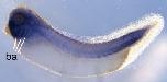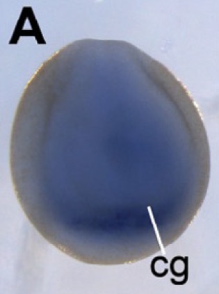 Fig. 2. Expression of Pmp22 in whole-mount in situ hybridization. (A) Expression of Pmp22 at stage 15 in the cement gland. Anterior view, dorsal to top. (B) At stage 22,