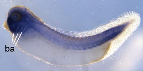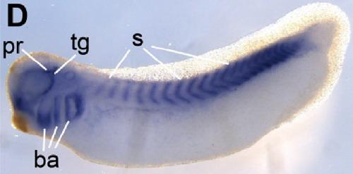 expressed in the profundal and trigeminal ganglia, cranial mesenchyme, and somites at stage 29/30, where it was also beginning to be expressed in the branchial arches.