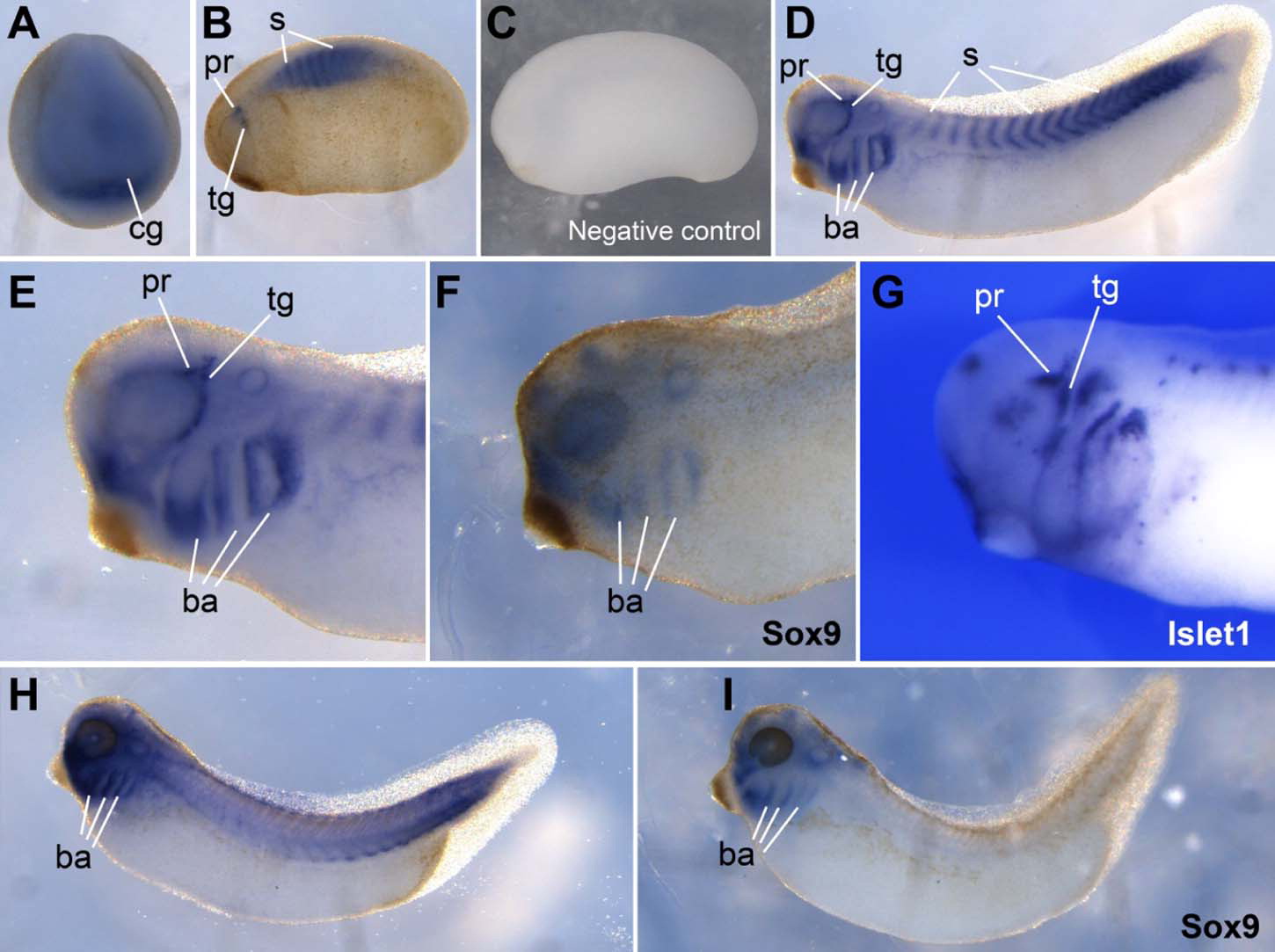 for Sox9 and Islet1. (H, I) At stage 35, both Pmp22 and Sox9 were detected in the branchial arches. Panels (BâI), lateral view, anterior to the left. ba, branchial arches; cg,