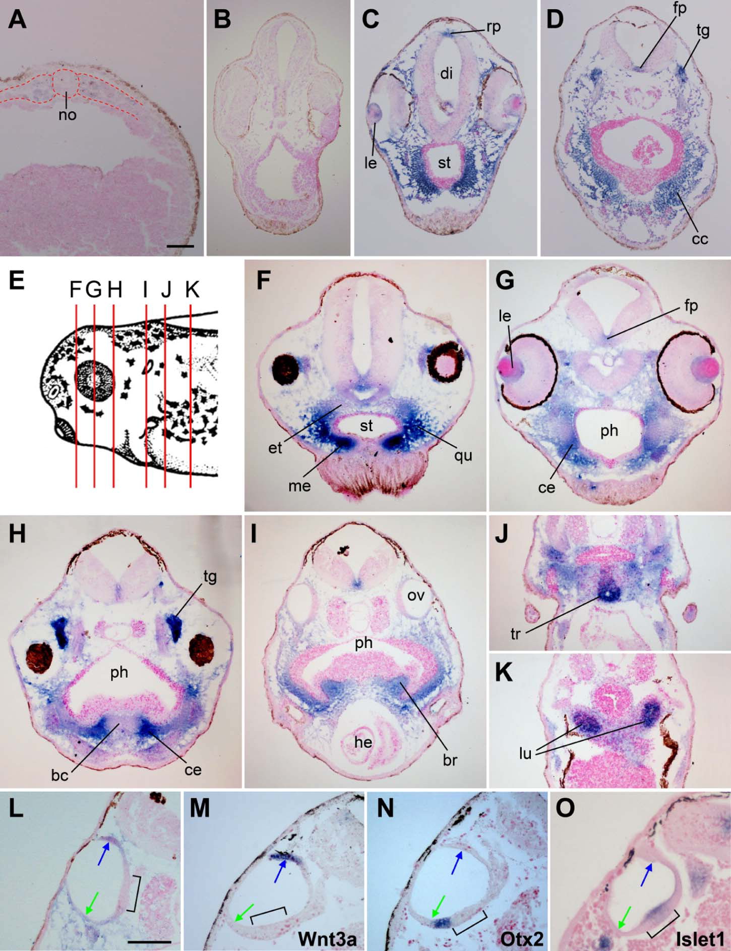 cartilage; no, notochord; ov, otic vesicle; ph, pharynx; qu, quadrate cartilage; rp, roof plate; st, stomodeum; tg, trigeminal ganglion; tr, trachea. The scale bar represents